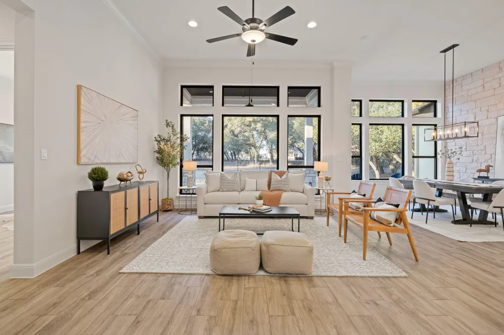 Nestled in the prestigious Clearwater Ranch community of Liberty Hill, this stunning 3,298 sq. ft. home sits on a sprawling 1.128-acre lot shaded by over 100 majestic oak trees. Offering exceptional flexibility, the home features up to 6 bedrooms or a versatile layout with 4 bedrooms, a game room, and a dedicated study—perfect for today’s dynamic lifestyles. Designed with an open floor plan, the interior showcases wood-look hard tile flooring, soaring ceilings, striking wood beam accents, and elegant crown molding throughout. The chef’s kitchen is a true centerpiece, complete with two built-in ovens, a gas range, two dishwashers, an oversized pantry, and abundant storage—ideal for entertaining and everyday living. The luxurious primary suite provides a peaceful retreat, featuring a spa-like bath with a soaking tub for ultimate relaxation. The spacious living area is anchored by a cozy gas fireplace, creating a warm and inviting atmosphere. This property offers serene views of the expansive backyard beyond the fenced portion, providing endless possibilities for outdoor living, entertaining, or simply enjoying the natural surroundings. This home is loaded with premium upgrades, including a 22kW Generac whole-house generator, lightning rod system with whole-house surge protector, a water softener system and an iron-fenced yard. The oversized 3-car garage features an included Tesla wall charger, epoxy floors and 8-foot doors, offering ample space for vehicles, storage, and hobbies. Located in a dark-sky community, Clearwater Ranch is ideal for stargazing and enjoying peaceful Hill Country evenings. Experience the perfect balance of luxury, space, and functionality in this exceptional Liberty Hill home.