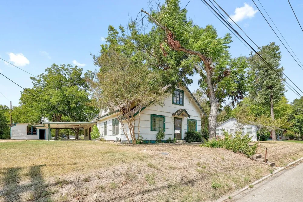 This single-family residence built in 1925 sits on almost an acre of land. This home presents an inviting canvas ready for your personal touch. With three bedrooms, two bathrooms, two living areas and a dining area adjacent to the kitchen for ease of serving meals. Imagine the possibilities for each room, transforming them into personalized spaces that cater to your unique lifestyle. The outdoors boasts endless possibilities. The mature trees provide shade all day. The large workshop has plenty of workspace and running water. Two sheds on the property provide storage for your lawn mower, tools and ample space to use as a potting shed. The shed with a window A/C unit has floor to ceiling shelving for climatized storage. A covered carport/patio provides shelter from the heat and rain and is added space for outdoor entertaining. This is a perfect Investment Property, Flippers Renovation or Handyman's project. CAUTION!! DO NOT ACCESS THE PROPERTY USING THE DRIVEWAY AT THIS TIME. Oncor Energy is replacing a power pole and and repairing the driveway. The work should take at least 2 weeks.